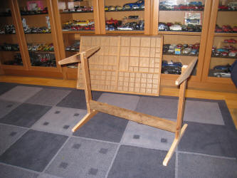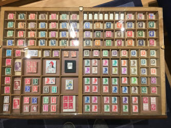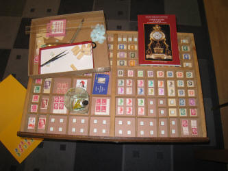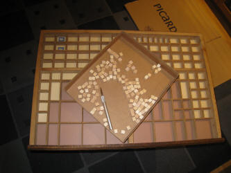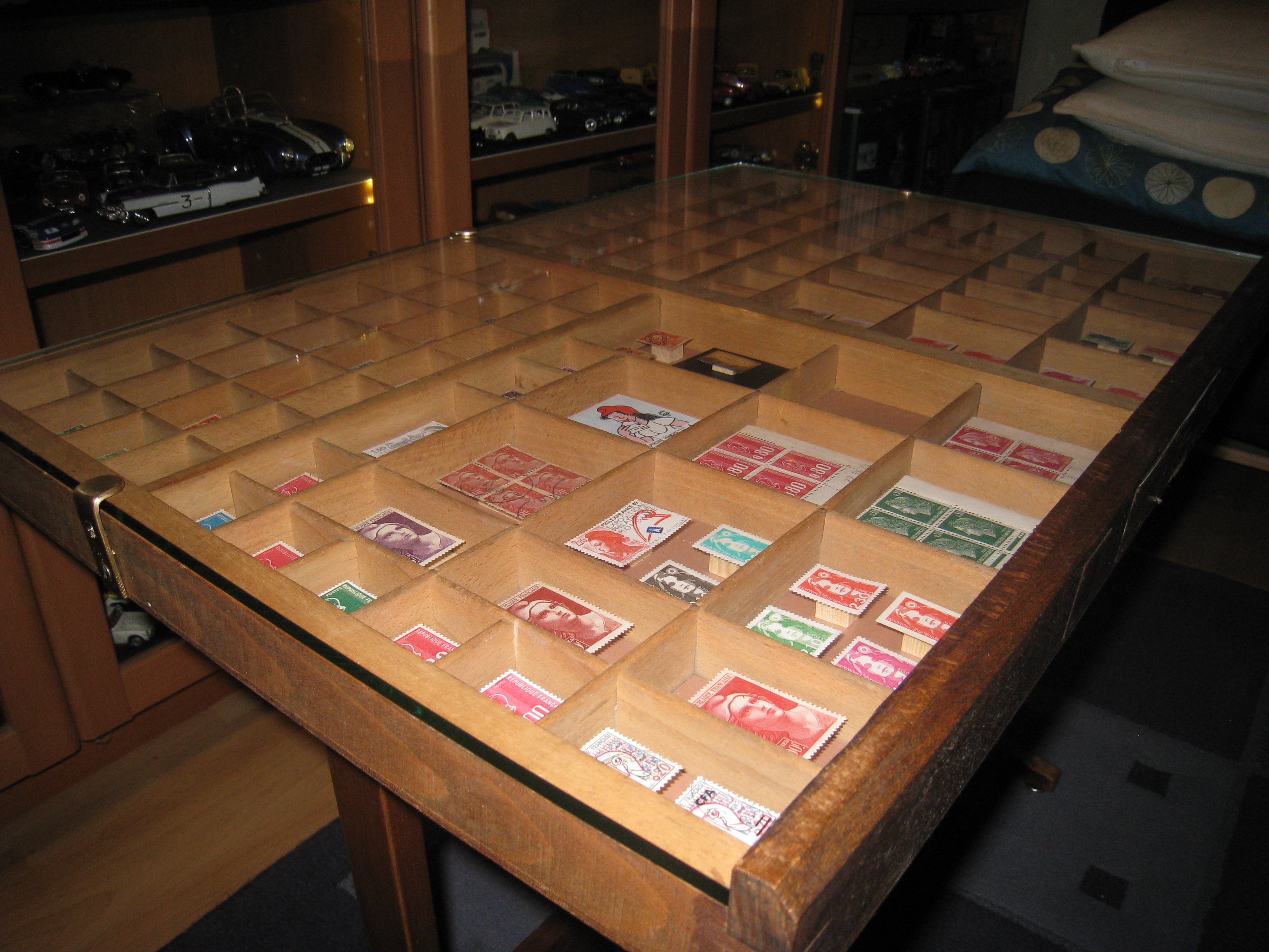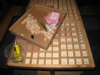Chaque cassetin reçoit un fond de papier cartonné (deux teintes) découpé sur mesure ; sur chacun d'eux est collé un petit cube de bois (1 cm de côté) découpé avec la mini-scie circulaire ; une pastille adhésive double face fixe le timbre. |