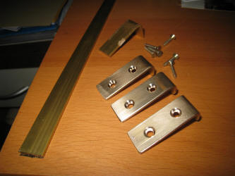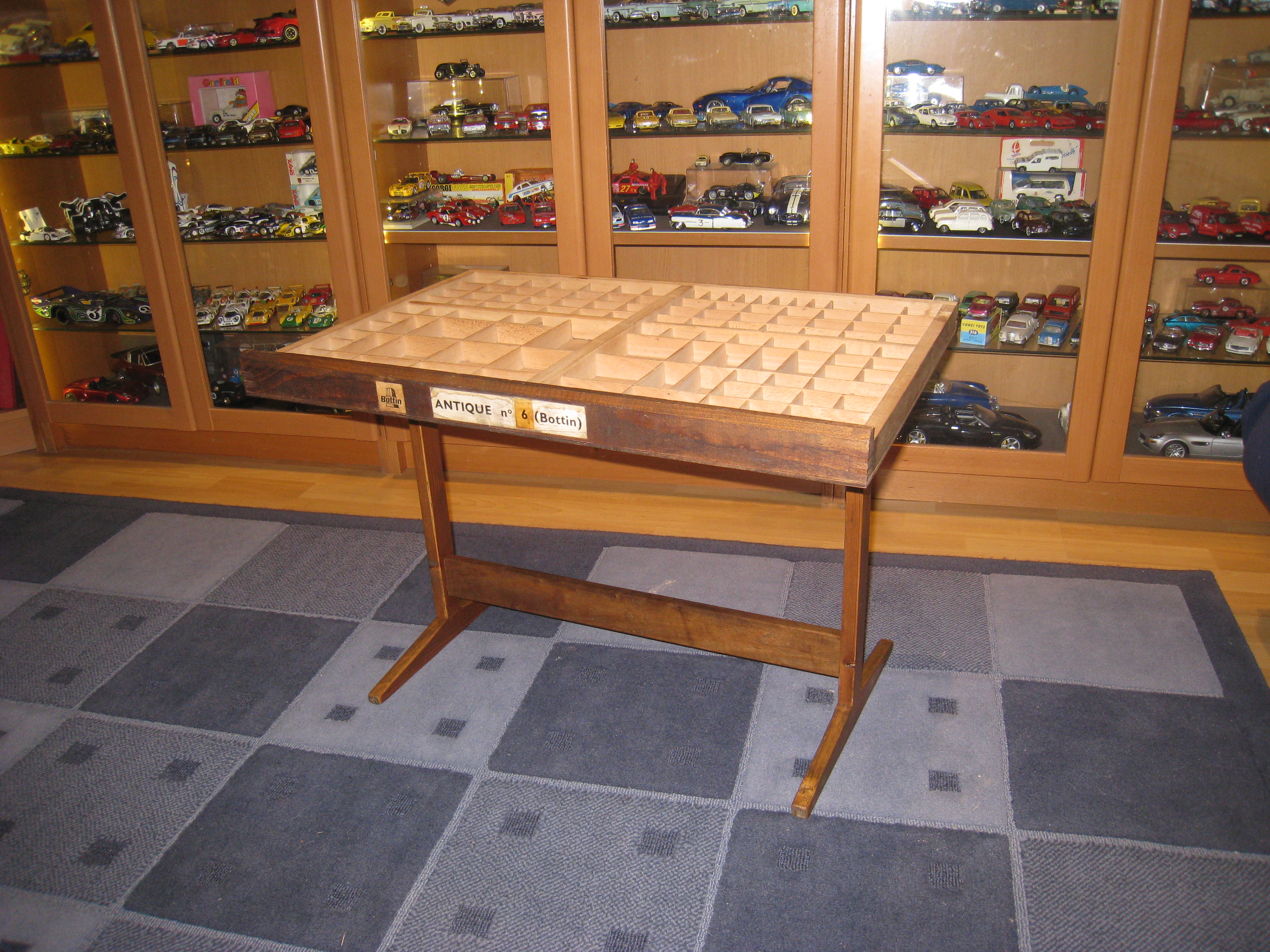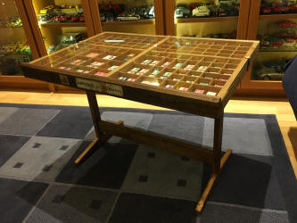 La casse est nettoyée et vernie en protégeant les étiquettes; le piètement est réalisé à partir de vieilles plinthes et tasseaux; le verre de 6mm est fixé par des cornières de laiton façonnées à partir d'une lame. |