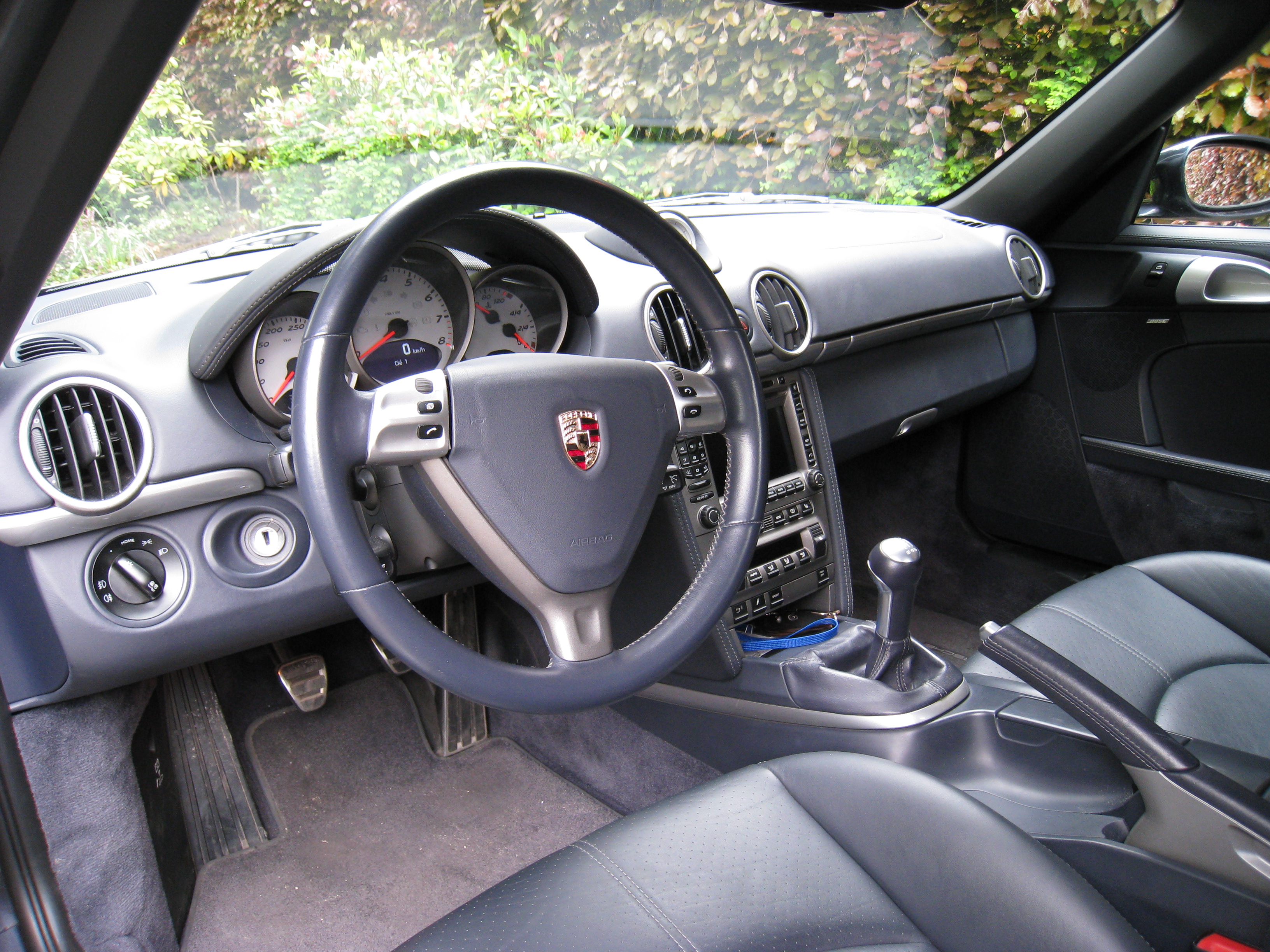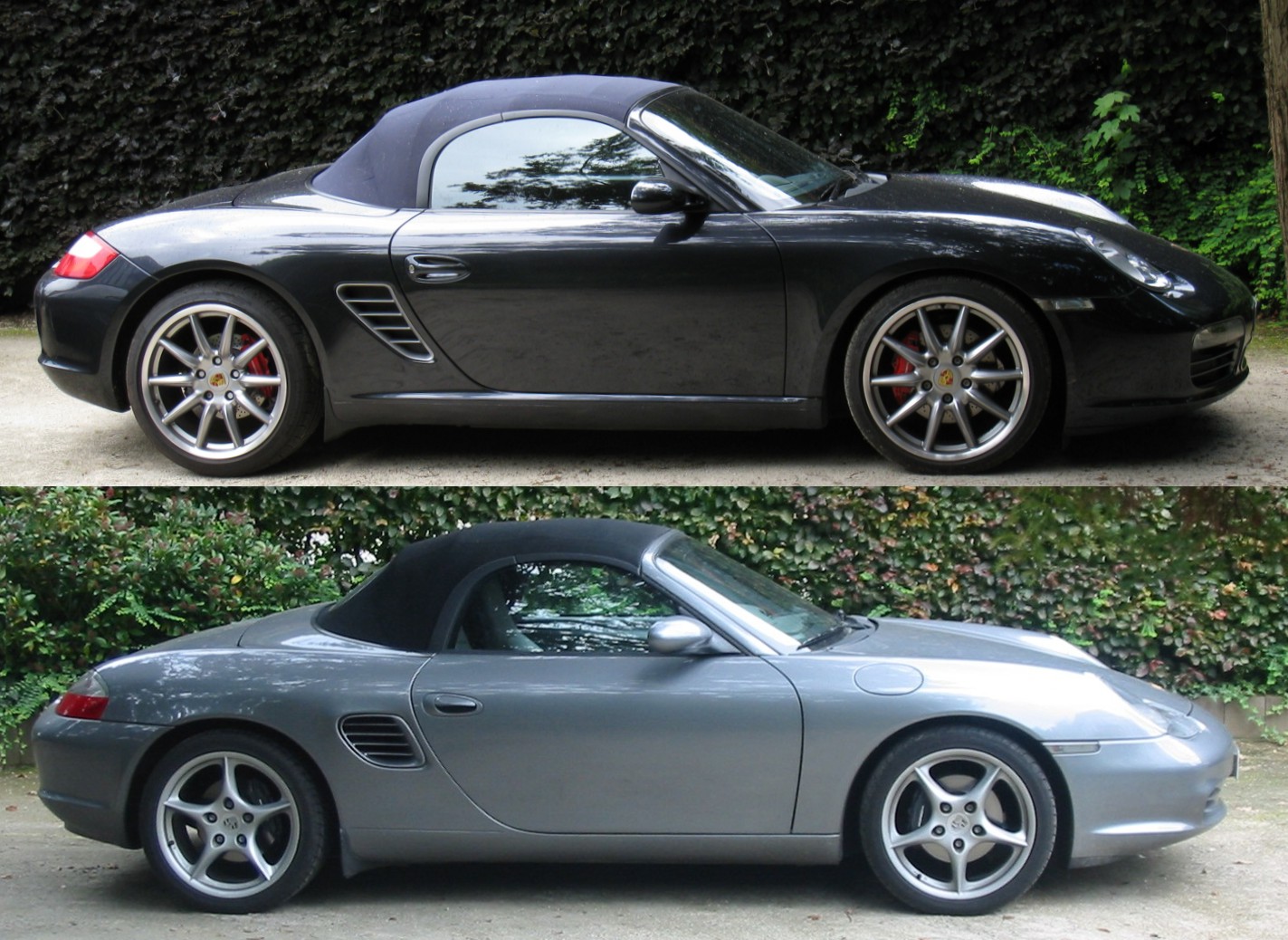 Par rapport à la 986 Même si ça ne saute pas aux yeux, il n'y a que 20% de pièces communes entre les 986 et 987. La structure générale est reprise mais, à part les portes (et encore...) et la baie de pare-brise, tout est différent. Le changement le plus flagrant est dans la face avant, avec un nouveau dessin des ailes, des phares, du capot et du bouclier. De profil les flancs sont plus creusés et/ou les ailes plus bombées, faisant sortir une nervure en bas de caisse; les méplats des ailes sont plus larges, les prises d'air sont plus longues et les vitres ont été redessinées. Les roues aussi sont un peu plus grandes (A l'arrière : 265.35/19" au lieu de 265.35/18", soit 2.5 cm de plus en diamètre; à l'avant 235.40/19" au lieu de 225/45/18", soit 1 cm de plus). Les coffres offrent 35 L supplémentaires, mais il n'y a plus de roue de secours, remplacée par un kit de réparation... :-( Moins flagrant, la face arrière arbore pourtant un nouveau dessin de tous ses éléments (feux, couvercle de malle, bouclier et spoiler). L'intérieur aussi est entièrement redessiné, d'aspect plus flatteur (tableau de bord, portes, console, etc.), surtout dans cette finition. Progrès appréciable, la capote se manœuvre jusqu'à 50 km/h.