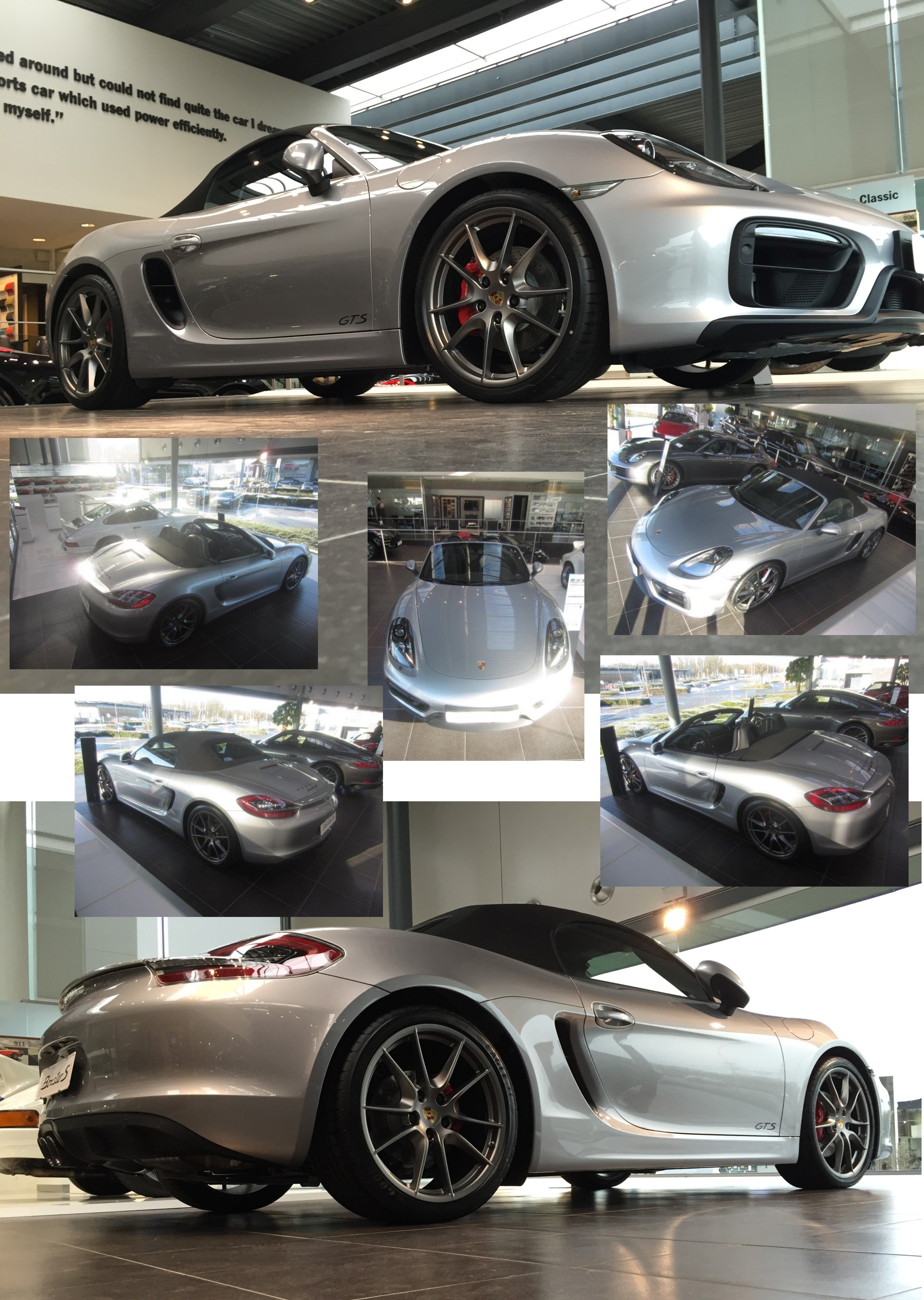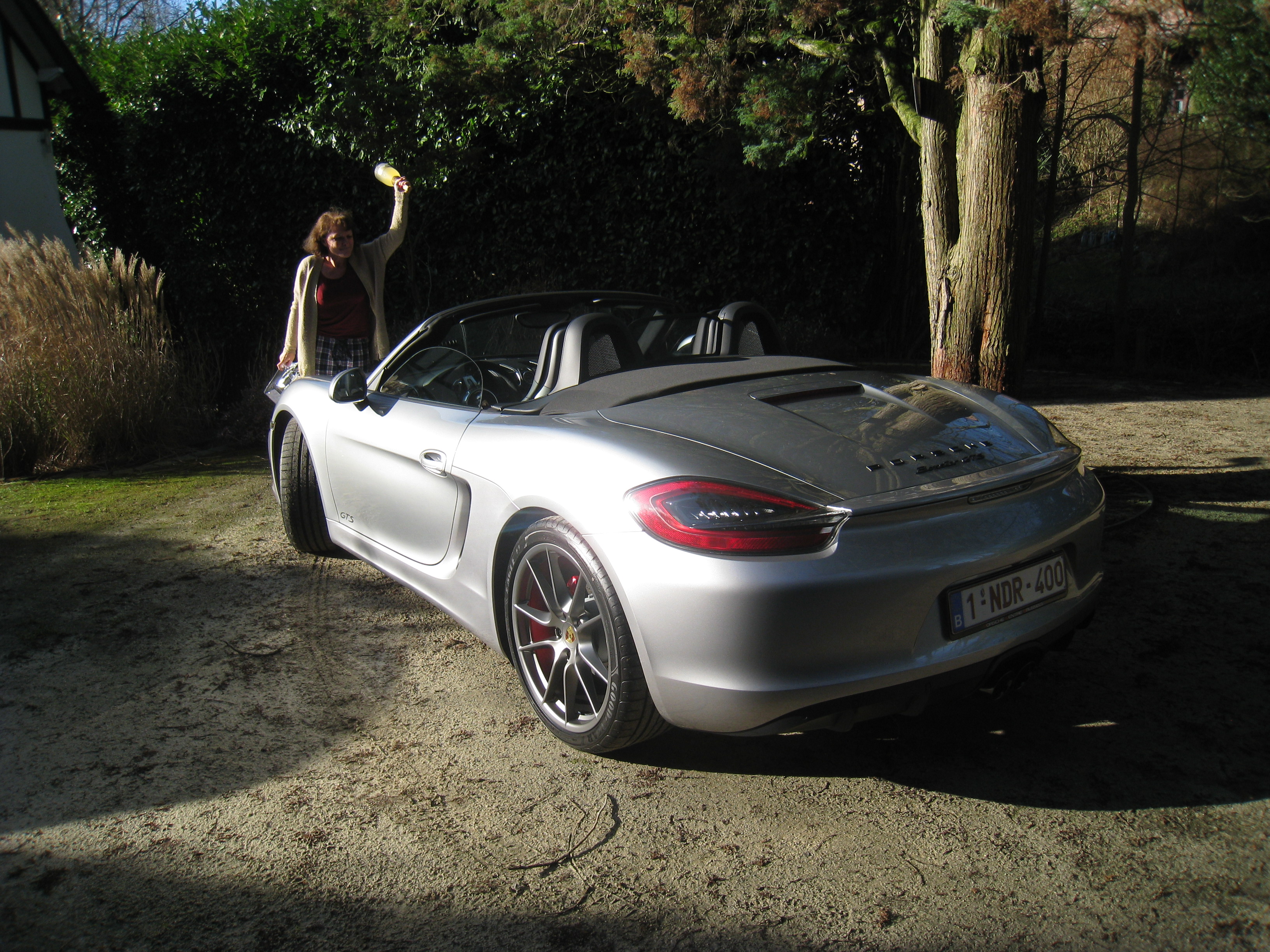 Le Boxster 981 a été présenté en Juin 2012, et cela fait 2 ans que j'épluche les annonces pour trouver un S bien équipé, avec moins de 30.000 Km, autour de 60 K€. Mais je ne trouve pas, toujours quelque chose qui coince, trop loin, pas la bonne couleur, pas le pack sport Chrono ou l'échappement sport, etc. En plus, une question existentielle: boite manuelle ou PDK ? Rendez-vous est pris chez Porsche en Janvier 2016 pour essayer un Boxster avec boite PDK, histoire de voir ce que ça donne dans le traffic. Bien, mais le 2.7 est trop court avec ses 265 Ch. Seulement voilà, il y a dans le showroom une GTS; exactement ce qu'il me faut ! Par rapport à une 981 S, la GTS se distingue par le 3.4 L qui délivre 330 Ch (au lieu de 315), des éléments de carrosserie spécifiques et un équipement riche : suspension active (PASM), pack sport chrono avec suspension moteur active, échappement sport, jantes Carrera S 20", phares bi-xénon directionnels (PDLS) à fond noir, intérieur tout cuir, sièges sport, volant sport design, feux arrières teintés, pack carbone, etc. A cela s'ajoutent pour la mienne la boite PDK, le pack intérieur GTS, le PCM/GPS/Téléphone, la sono Bose, la climatisation bi-zone, les aides parking avec caméra de recul, sièges chauffants, cruise control, rétros rabattables et direction "power steering plus". La peinture est spéciale (Silver GT metallic) et les jantes sont peintes couleur "platinum". Mine de rien, plus de 20K€ d'options sur une base à 74 K€... Son numéro de série - WP0ZZZ98ZGS130999 - indique que c’est la 30999ème Porsche 981, année modèle 2016, construite à Zuffenhausen (Z). Le numéro indique aussi que le constructeur est Allemand (W), marque Dr. Ing h.c.f. Porsche AG (P), qu'il s'agit d'une voiture particulière (0) et qu'elle est destinée au marché Européen (ZZZ).