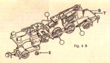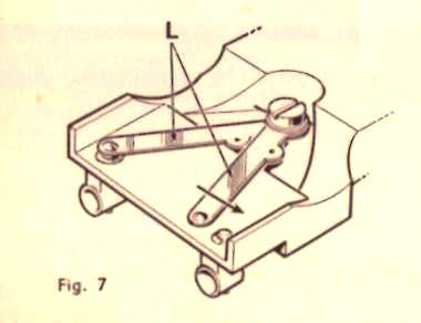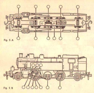 On pourra profiter du fait que le châssis est ainsi séparé de la carrosserie pour huiler finement les deux paliers de l'arbre de l'induit du moteur et la vis sans fin de commande à l'endroit indiqué par des flèches sur la figure 6 B, en prenant toujours grand soin de ne pas huiler le collecteur. De son côté, le nettoyage du collecteur pourra se faire en passant la pointe d'une épingle dans les trois fentes (prendre soin de ne pas toucher le fil d'enroulement de l'induit).