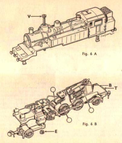 Pour remonter la locomotive, engager le tenon T du châssis dans l'ouverture prévue à l'arrière de la carrosserie, en plaçant en même temps le bissel à deux roues bien parallèle au châssis. Faire pivoter la carrosserie afin qu'elle reprenne bien sa place sur le châssis, engager à fond la longue vis V dans le dôme de prise de vapeur jusqu'à ce qu'elle affleure ce dernier. Prendre la locomotive dans la main gauche en tournant les roues vers le haut et en maintenant avec un doigt de la main gauche la longue vis V pour l'empêcher de tomber. Placer le bogie avant en le passant dans le bon sens, engager l'écrou E et le visser légèrement avec un tournevis. Enfin, retourner la locomotive et serrer sans excès la tète de la longue vis V. |